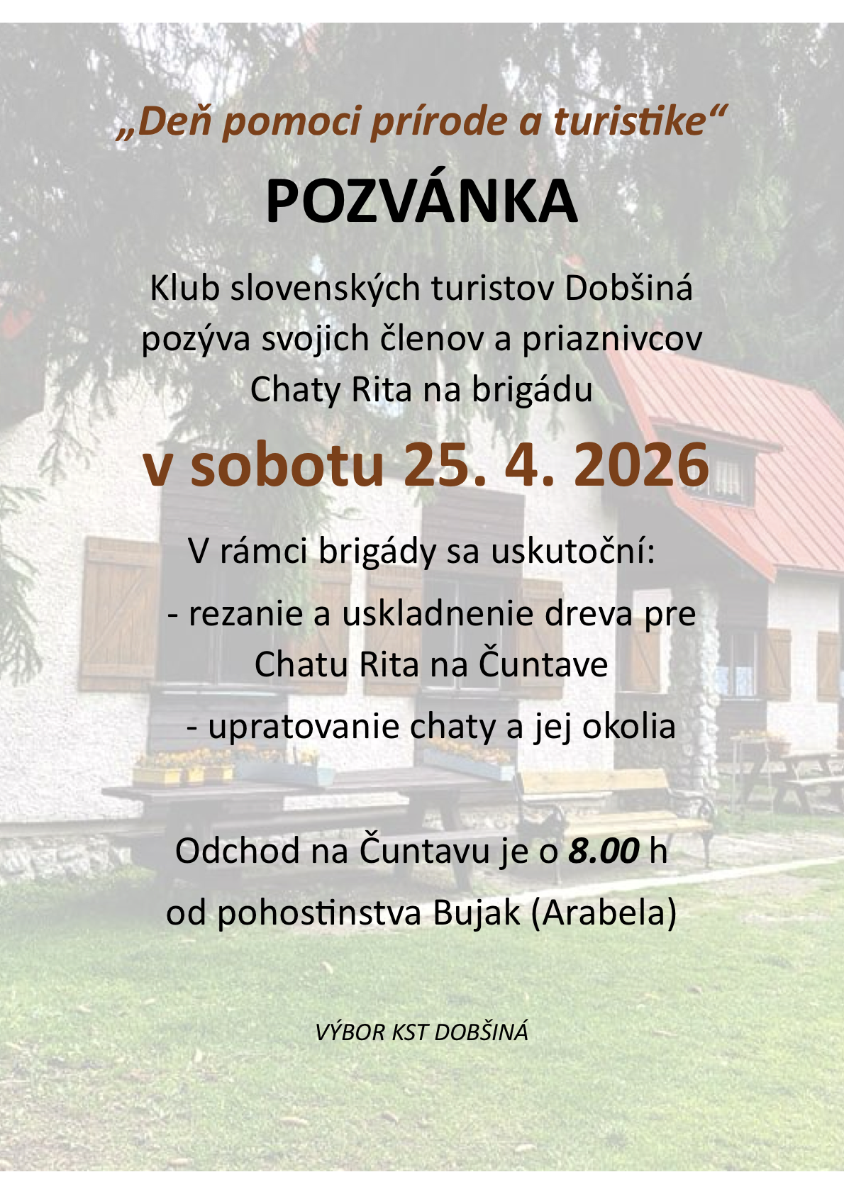 Klub slovenských turistov Dobšiná oznamuje svojim členom a priaznivcom turistiky, že dňa 25.4.2026 (sobota) organizuje brigádu na Čuntave.